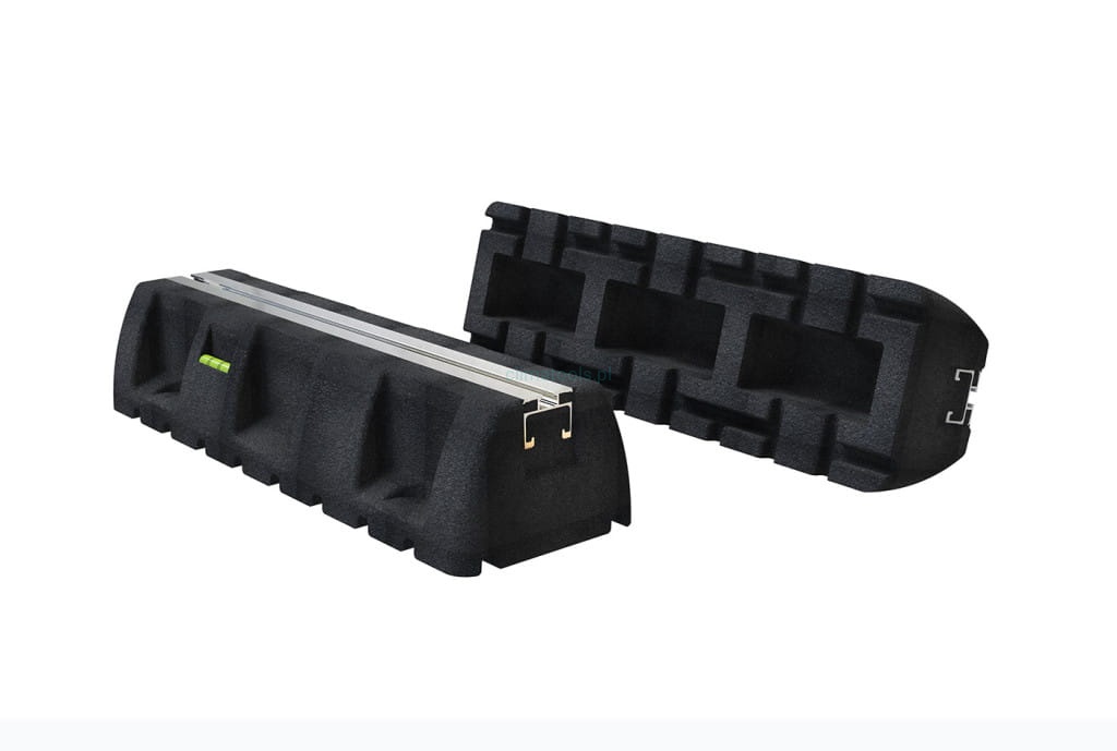 Podpora wykonana z sortowanej gumy recyklingowej SBR z zatopionym profilem aluminiowym.