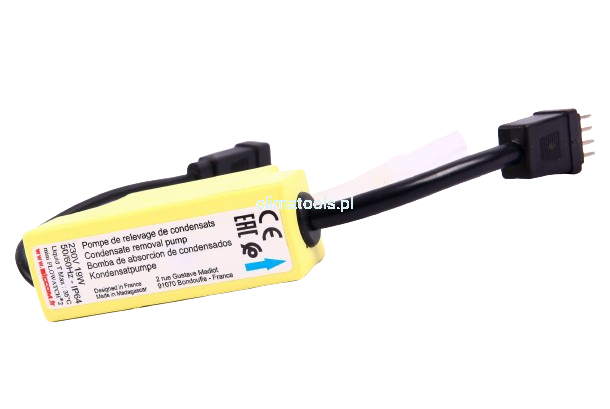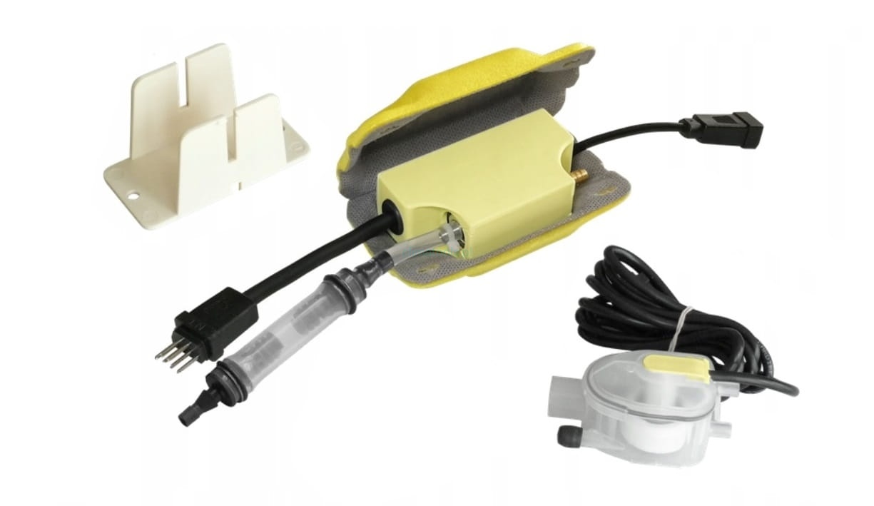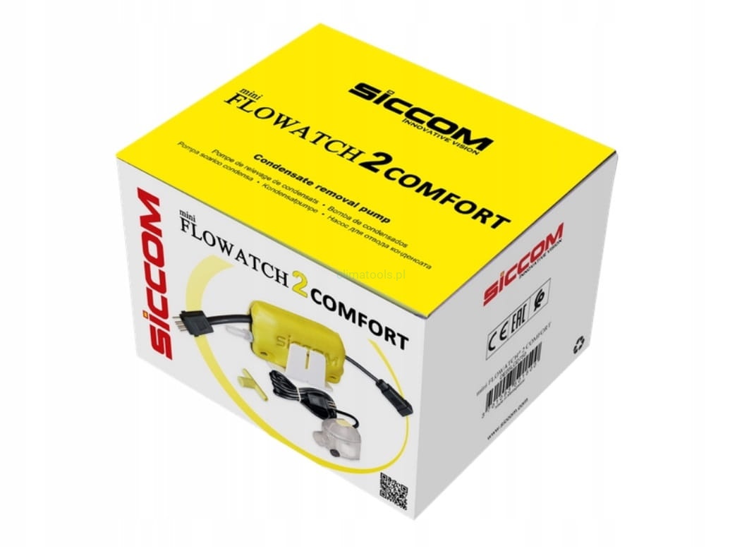 Pompka mini FLOWATCH 2 to przede wszystkim kompaktowe wymiary, dzięki nim pasuje do każdego klimatyzatora, w których wymagane jest ekonomiczne i bezawaryjne odprowadzanie skroplin. Pompkę marki Siccom cechuje dodatkowo duża wydajność oraz ciacha praca. Odporna na wodę (IP64) oraz wyposażona w alarm (5A), zapewnia niezawodność. Poza tym, pompka posiada zabezpieczenie termiczne w celu uniknięcia przegrzania.