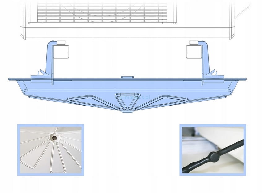Regulowany system uchwytów mocujących tacę do wspornika oraz uniwersalny odpływ o rozmiarze 16mm pozwalają na łatwą i szybką instalację produktu. Załączona w zestawie grzałka o mocy 15W/m wykorzystująca napięcie przemienne 230V umożliwia bezproblemowe podłączenie do instalacji zasilającej, a wbudowany termostat aktywuje grzałkę przy +3ºC, dzięki czemu nie ma potrzeby stosowania zewnętrznego urządzenia do sterowania ogrzewaniem. Sposób zamontowania przewodu grzejnego w specjalnych wytłoczeniach w dnie tacy zapewnia równomierne utrzymanie temperatury na całej powierzchni, co pozwala uniknąć zamarzania kondensatu na obrzeżach. Dzięki tym wszystkim opatentowanym rozwiązaniom produkt posiada szeroki zakres temperatury pracy od -40ºC aż do +65ºC.