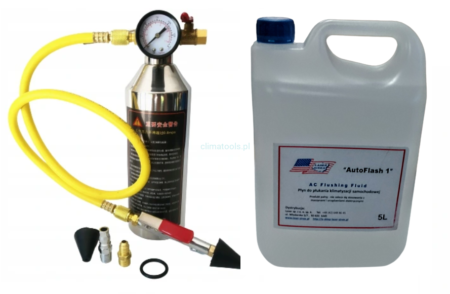 Profesjonalny zbiornik ciśnieniowy do ręcznego płukania układów klimatyzacji, wyposażony w manometr dla precyzyjnej kontroli ciśnienia. W zestawie znajduje się również 5 litrów specjalistycznego płynu AutoFlash, zapewniającego skuteczne usuwanie zanieczyszczeń i opiłków metalu z układów klimatyzacyjnych.