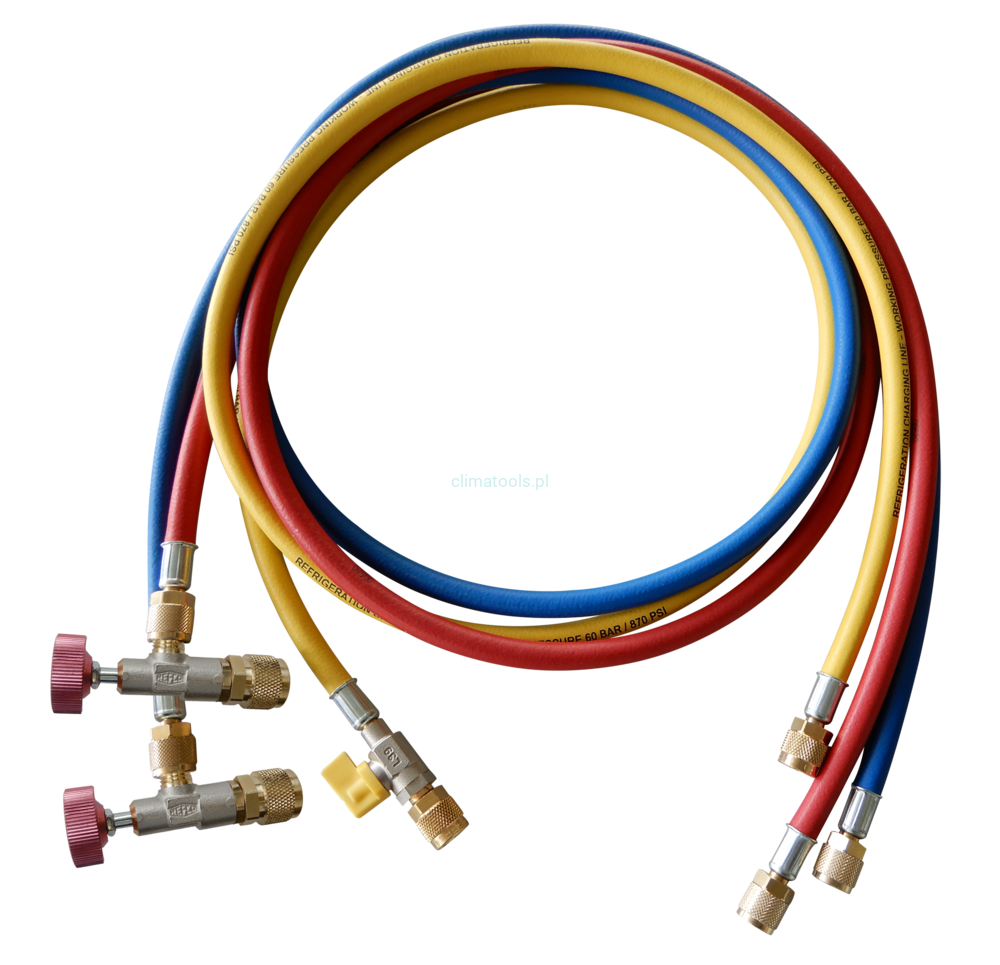 Zestaw 3 węży o długości 150 cm. Niebieski, czerwony i żółty, podłączenie proste. Niebieski i czerwony wąż, zakończone są zaworami serwisowymi do portu w układach klimatyzacji i pomp ciepła, (5/16" SAE) aby łatwiej napełnić i opróżnić układ. Żółty wąż 1/4" SAE posiada zawór kulowy.